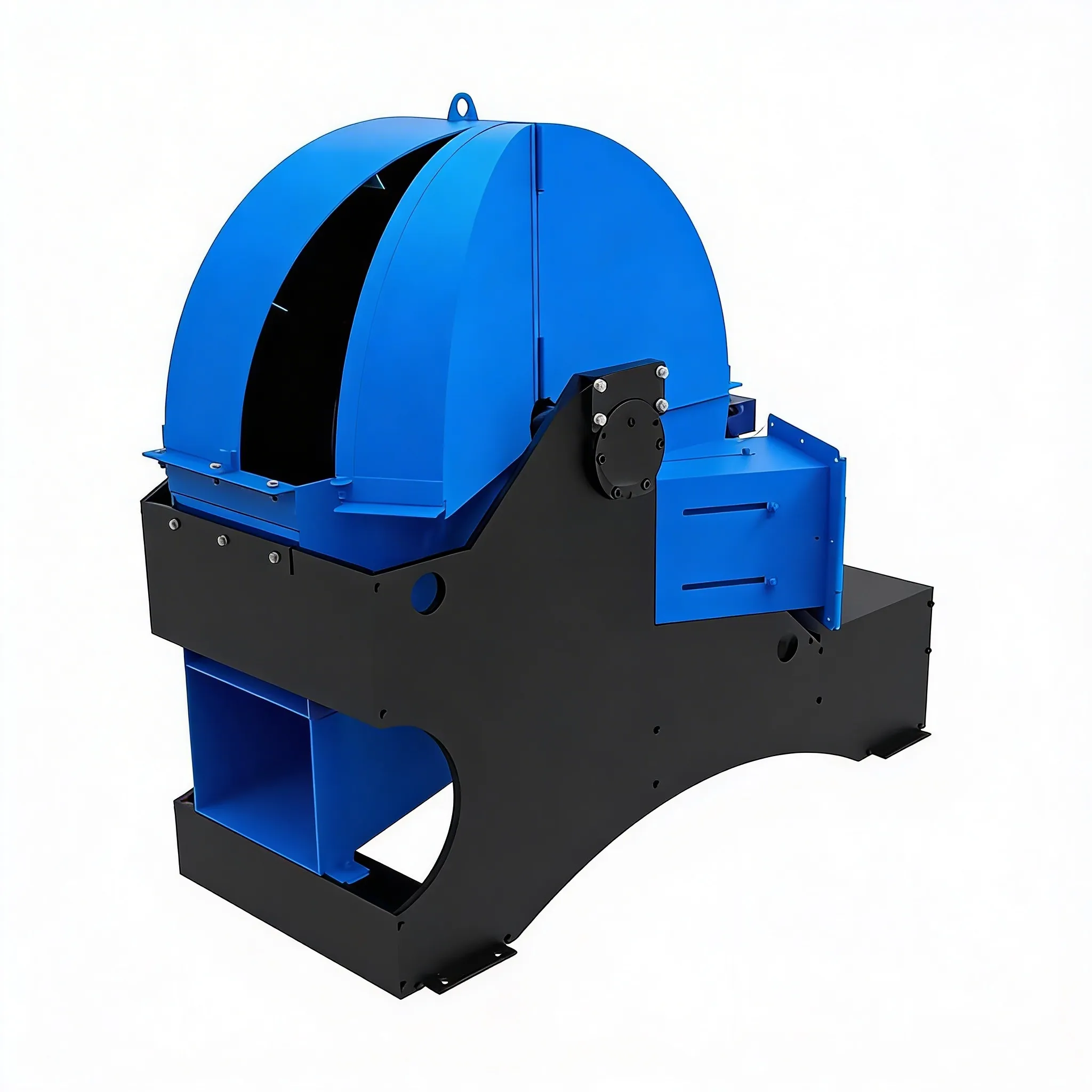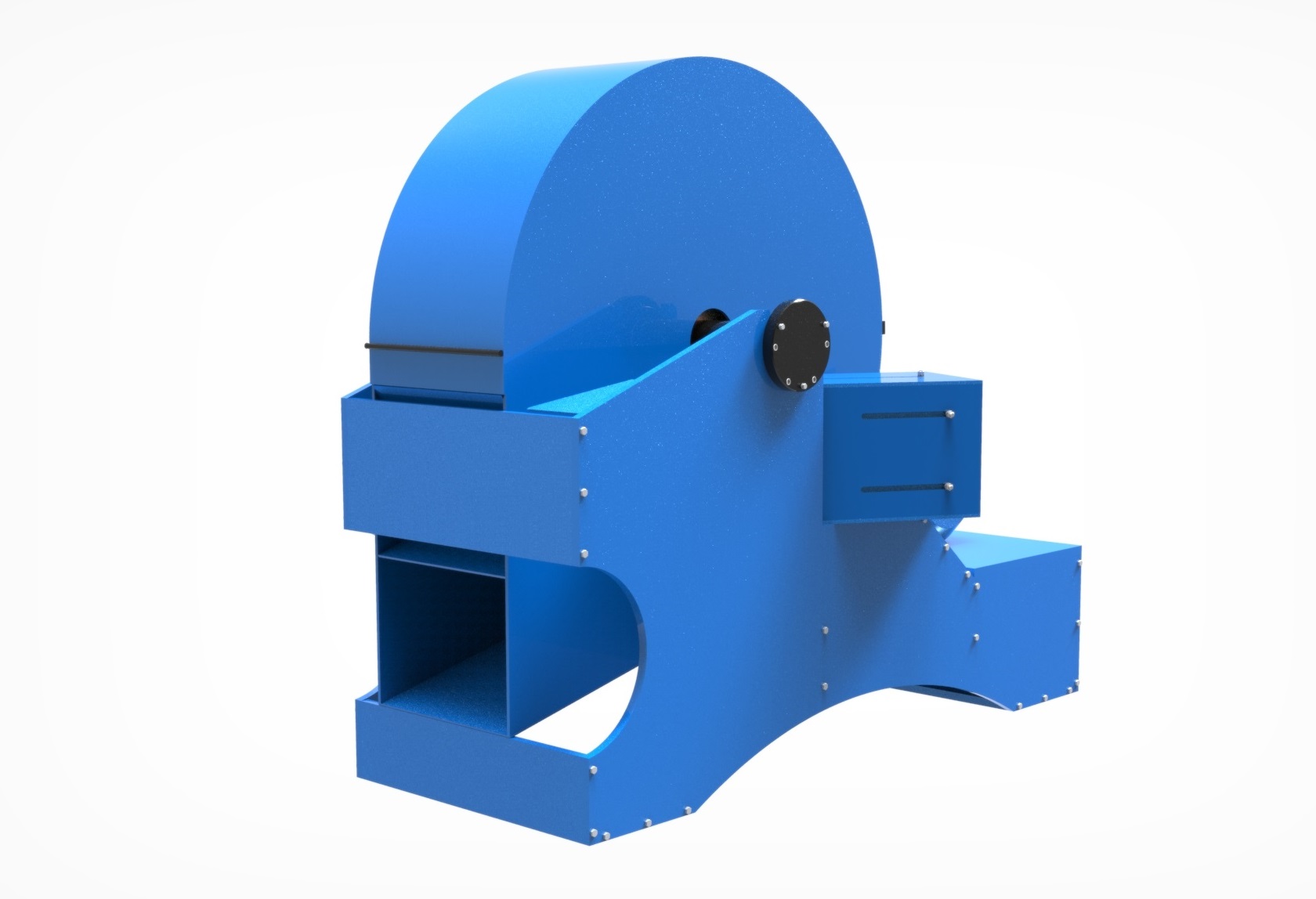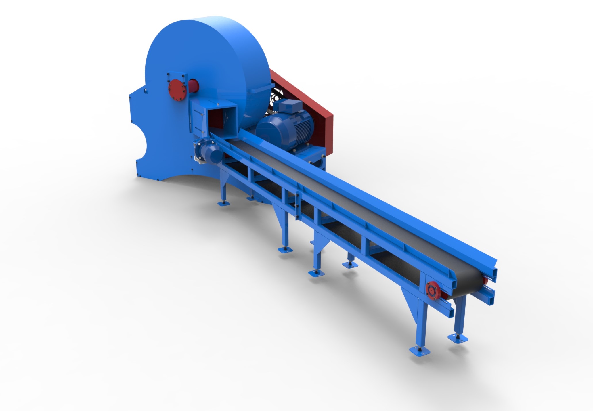- Установка имеет нижний выброс щепы (в накопительный бункер или в приемный патрубок пневмотранспортной системы). Благодаря высокой скорости вращения и большой площади лопастей ротор работает как вентилятор, позволяя выбрасывать щепу на значительное расстояние.
