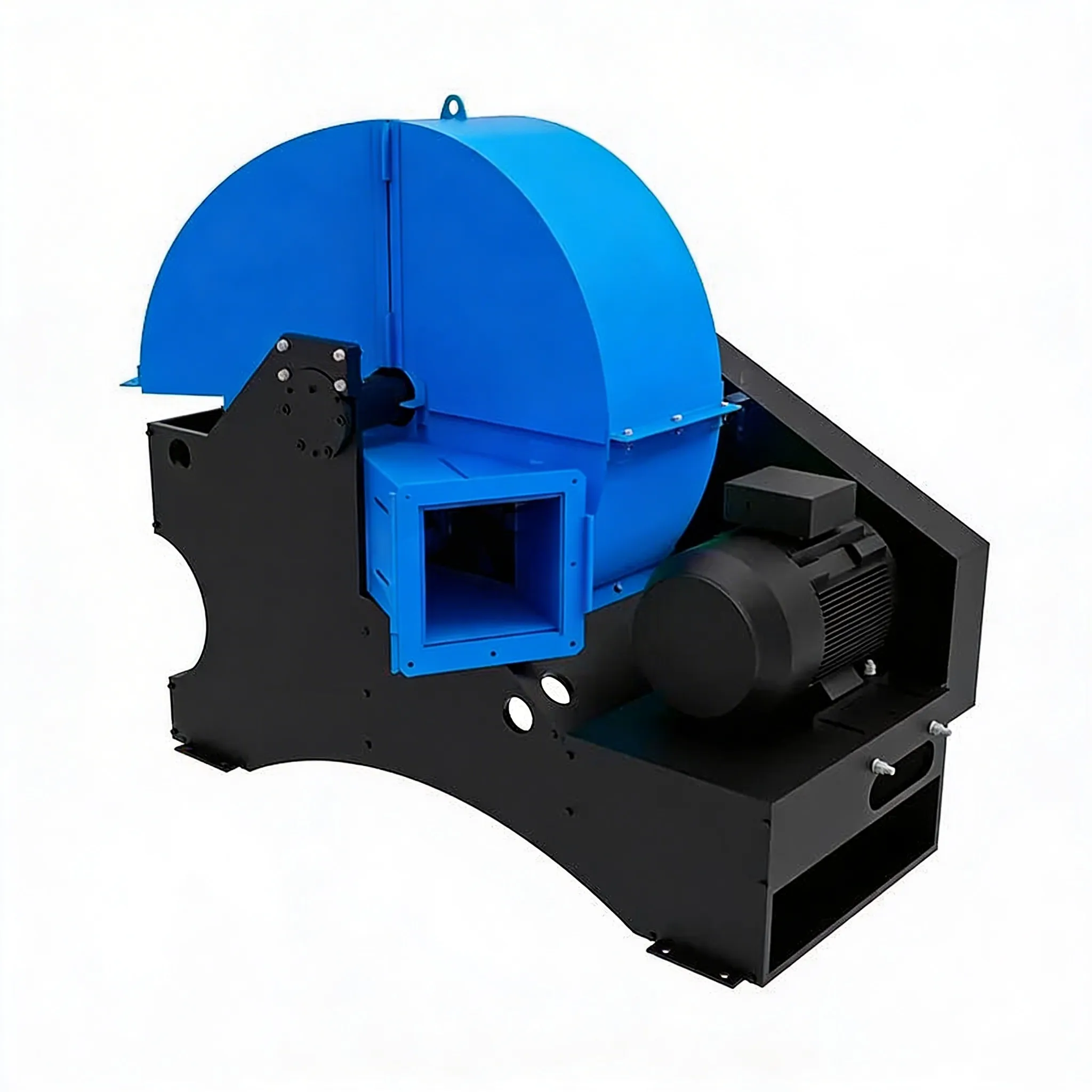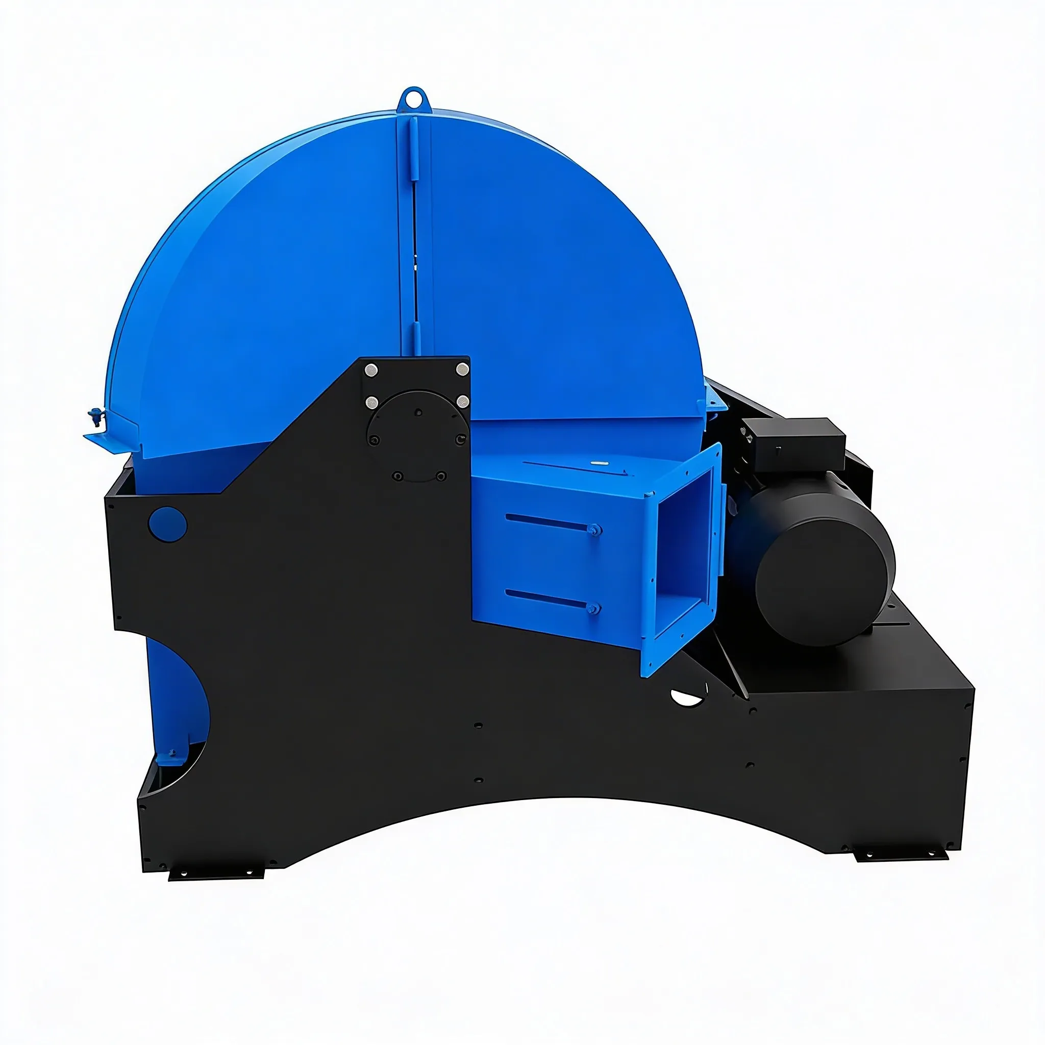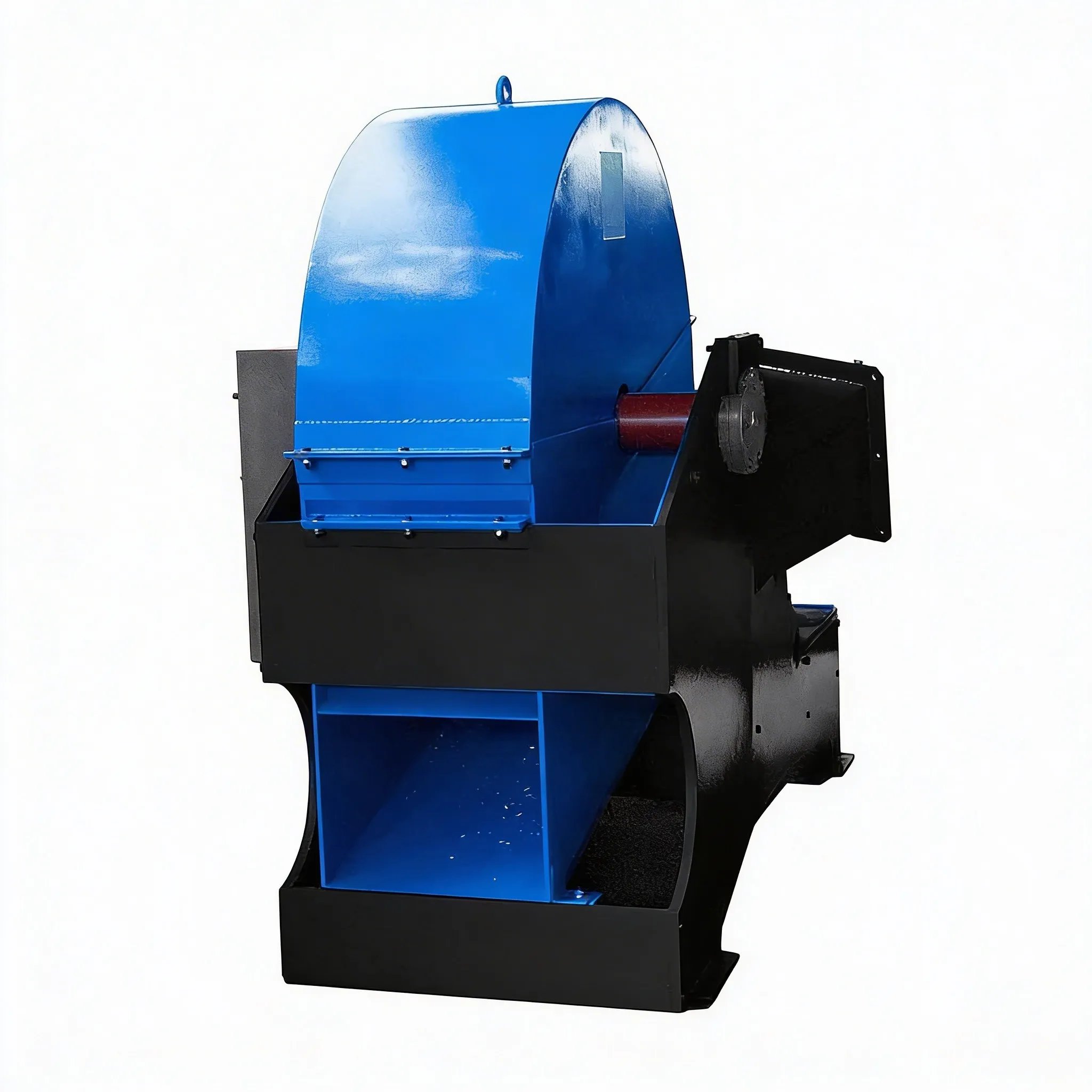 - Установка имеет нижний выброс щепы (в накопительный бункер или в приемный патрубок пневмотранспортной системы). Благодаря высокой скорости вращения и большой площади лопастей ротор работает как вентилятор, позволяя выбрасывать щепу на значительное расстояние.
